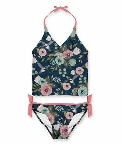 - Includes dark navy floral bird tankini top and dark navy floral bird bottoms (two pieces total)