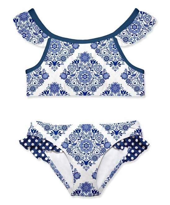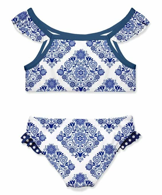 - Includes white and blue geometric floral ruffle-accent bikini top and matching bottoms (two pieces total)