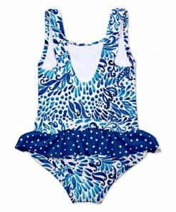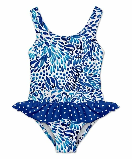 A UPF 50+ rating helps protect skin during long days in the pool, while a bright print and a ruffled accent provide cheerful style.