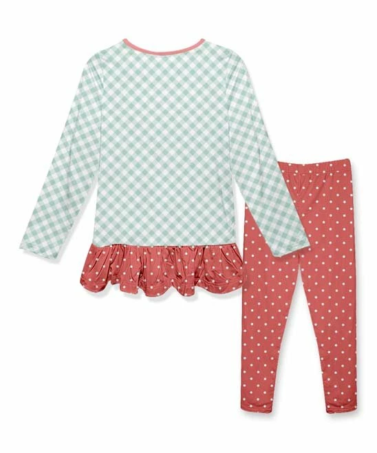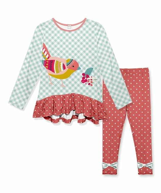 - Includes blue gingham bird ruffle-hem long-sleeve tunic and red polka dot bow-accented leggings (two pieces total)