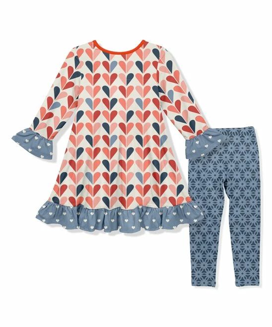- Includes cream heart dress and blue floral leggings