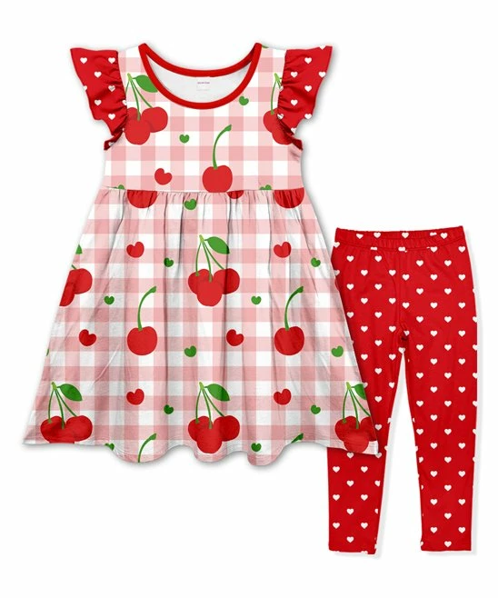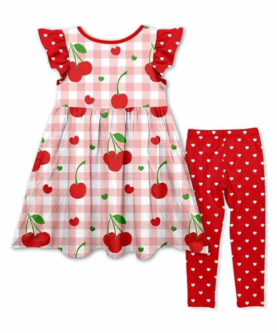 - Includes one pink and red cherry angel-sleeve dress and one red and white heart leggings (two pieces total)