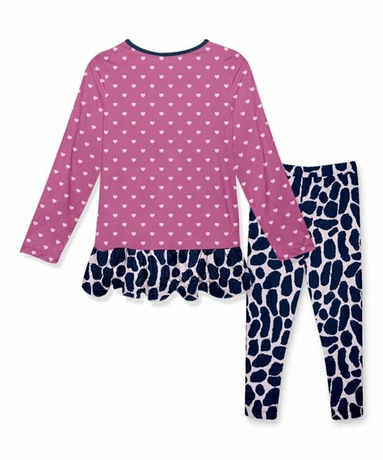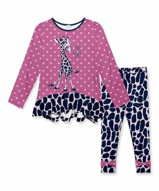 - Includes hot pink and navy heart giraffe ruffle-hem long-sleeve tunic and navy giraffe bow-accented leggings (two pieces total)