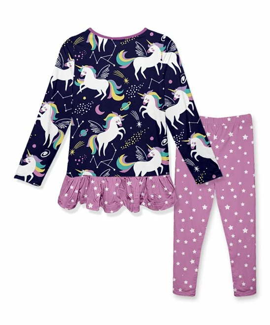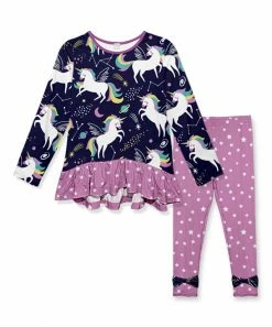 - Includes navy and pink unicorn stars ruffle tunic and purple stars bow leggings (two pieces total)