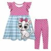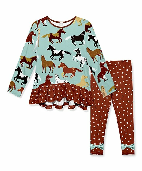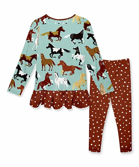 - Includes sky blue and brown horses ruffle-hem tunic and brown and white polka dot bow-accent leggings (two pieces total)