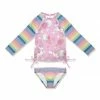 - Includes green cat hearts bow rashguard tee and pink hearts swim bottoms (two pieces total)