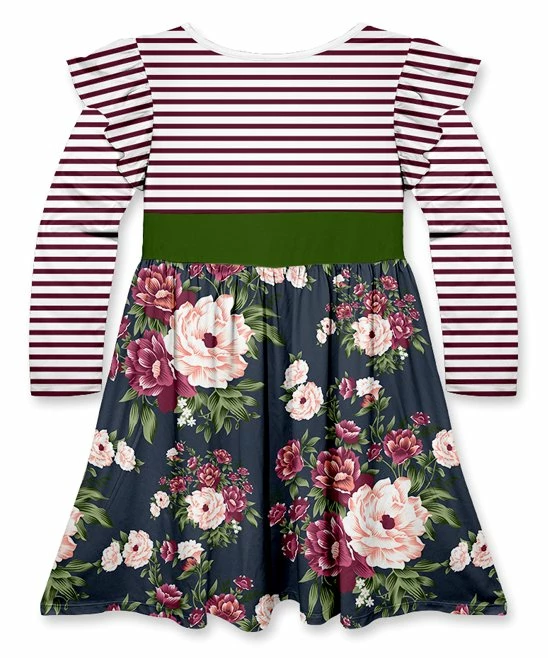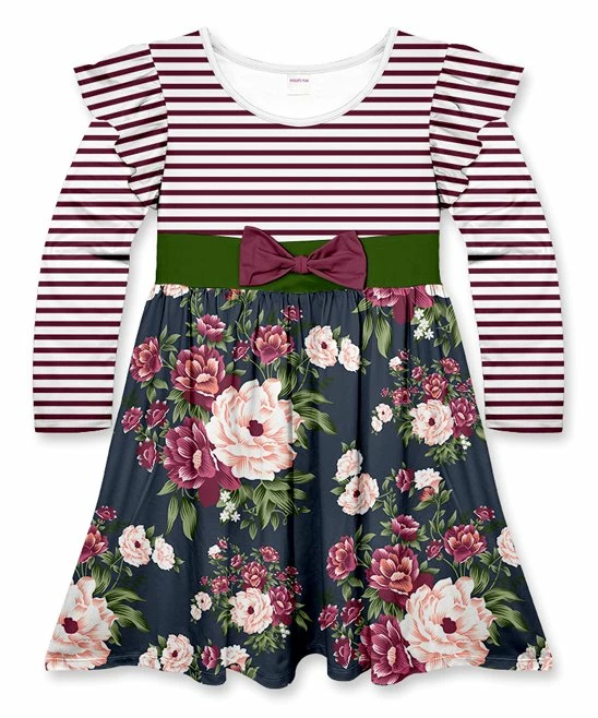 Fluttery ruffles at each shoulder lend lively appeal to this patterned dress marked with a cheerful bow.