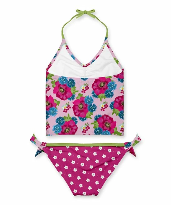 - Includes pink floral tankini top and pink dots swim bottoms (two pieces total)
