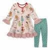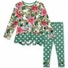 Fluttery ruffles at each shoulder lend lively appeal to this patterned dress marked with a cheerful bow.