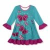 Wavy ruffles and fluttery sleeves add dynamic visual texture to your youngster’s look when they don this billowy shift dress finished with playful patterns for a look they’ll love.