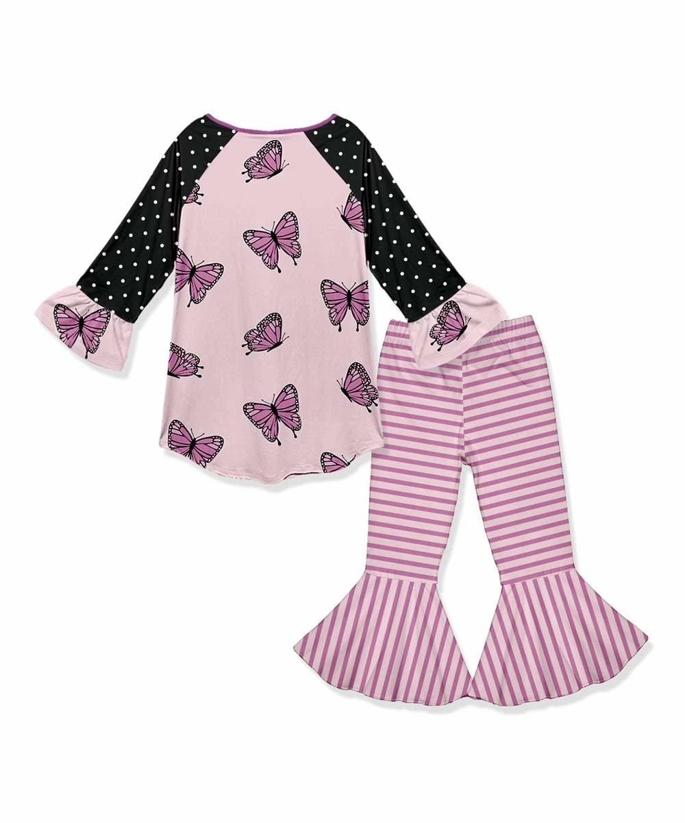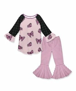 - Includes black and pink dots butterfly ruffle raglan tunic and one pair of pink and white stripe flare pants (two pieces total)