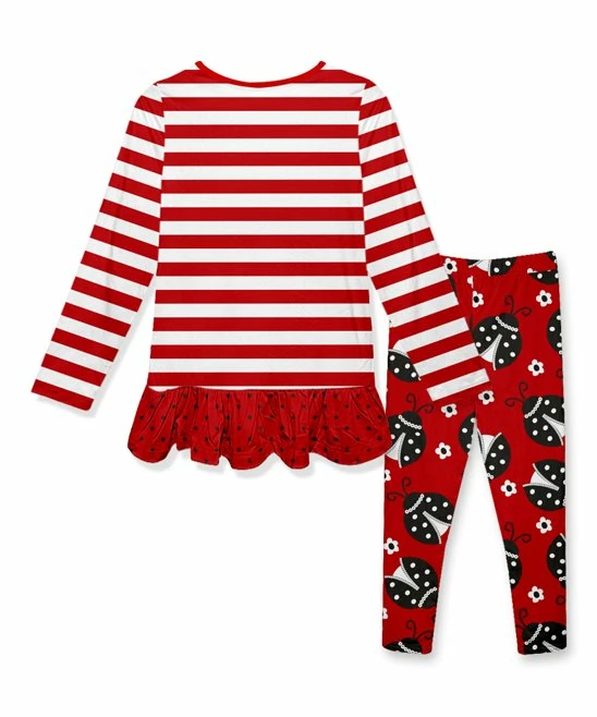 - Includes red and white ladybug pin dot stripe ruffle tunic and red ladybug bow leggings (two pieces total)