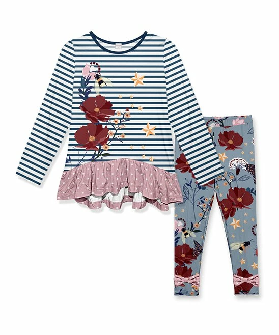 - Includes dark navy stripe bee tunic and steel blue floral pants (two pieces total)