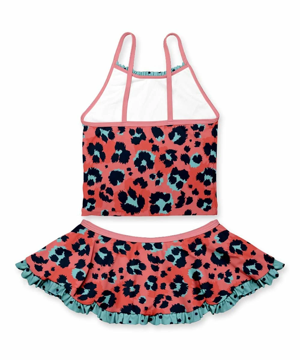 - Includes dark salmon and turquoise leopard tankini top and dark salmon and turquoise leopard skirted bikini bottoms (two pieces total)