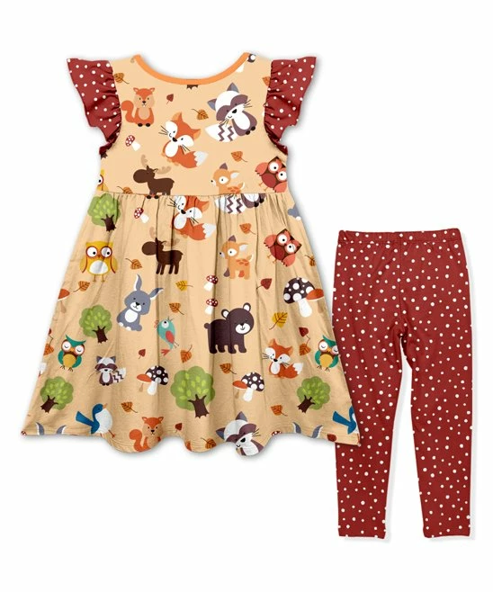 - Includes one light orange animals angel-sleeve dress and one red and white dot leggings (two pieces total)