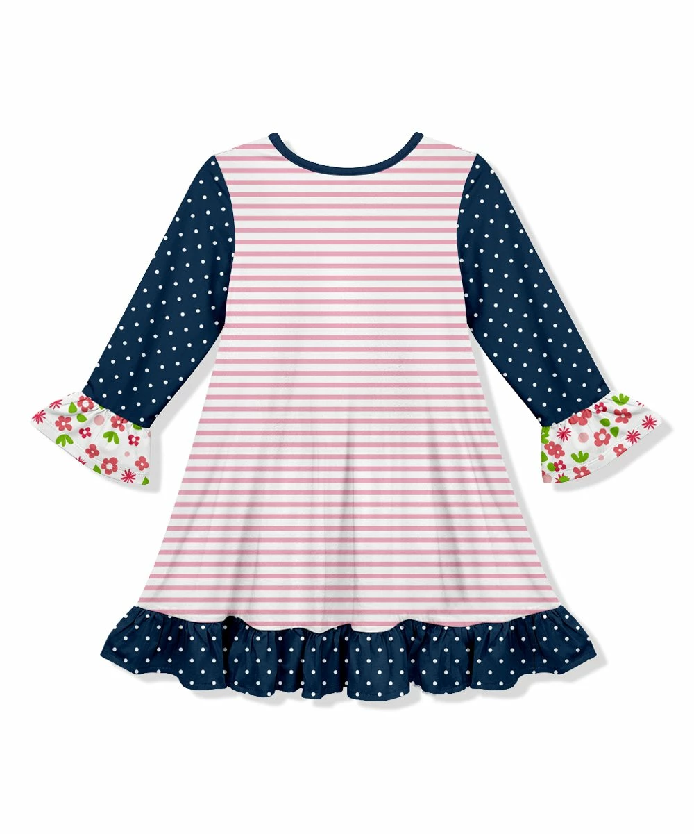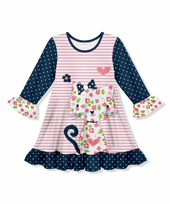 Have her looking sweet as can be for school days and play dates with this comfy shift dress trimmed in ruffles and emblazoned with a colorful cat design for added charm.