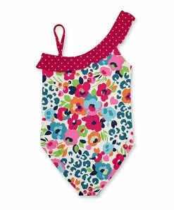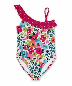 A vibrant asymmetrical ruffle delivers a flawless finishing touch to this breathable stretch-blend one-piece your favorite splashy kiddo is sure to love.