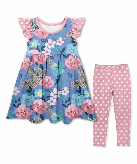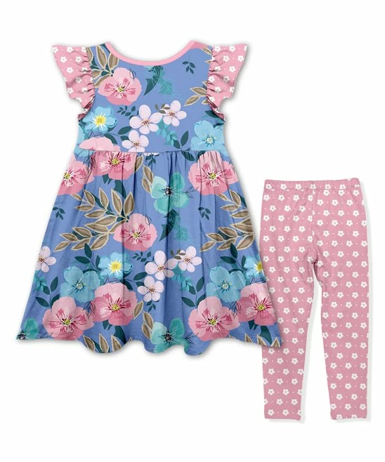- Includes one blue and pink floral angel-sleeve dress and one pink and white floral leggings (two pieces total)