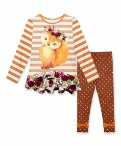 - Includes canary and white stripe floral fox ruffle tunic and clay pin dot bow leggings (two pieces total)