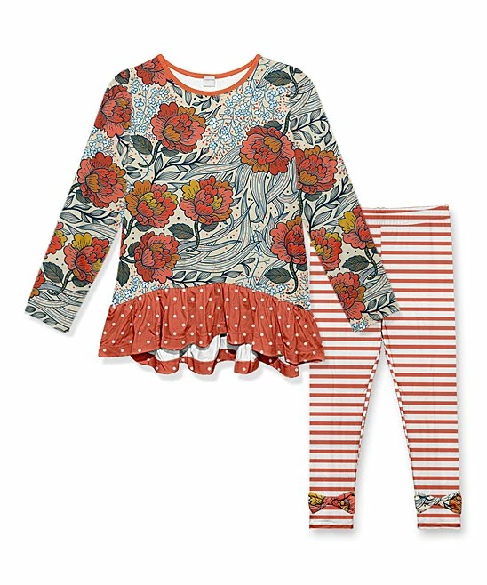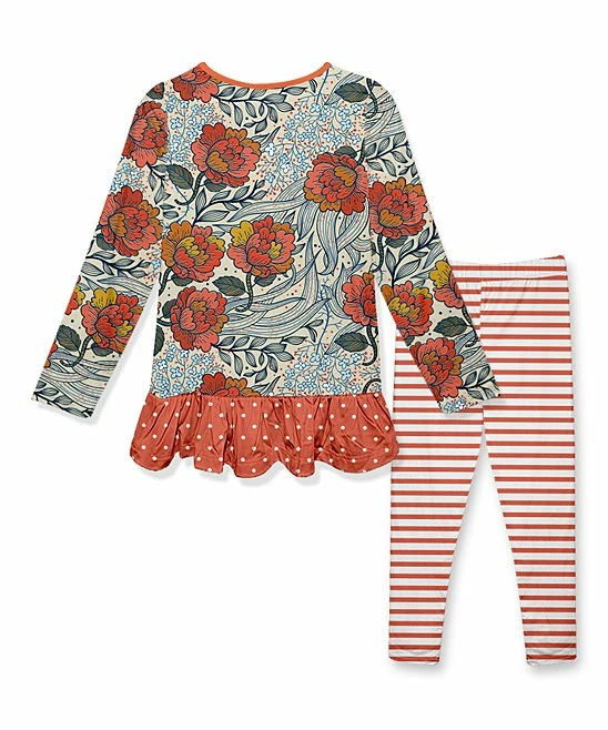 - Includes one rust and green floral ruffle tunic and red bow leggings (two pieces total)