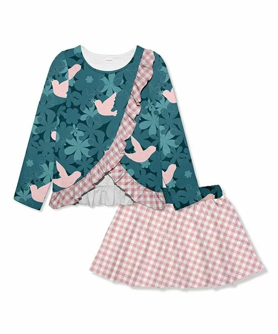 - Includes dark sea blue ruffle wrap top and pink check skirt (two pieces total)
