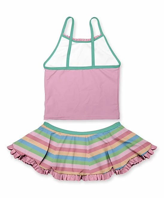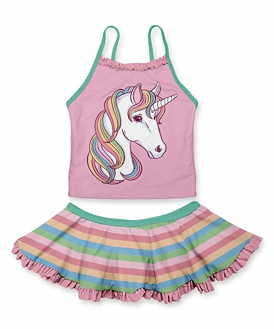 - Includes pink unicorn tankini top and blue and pink stripe ruffle skirted bottoms (two pieces total)