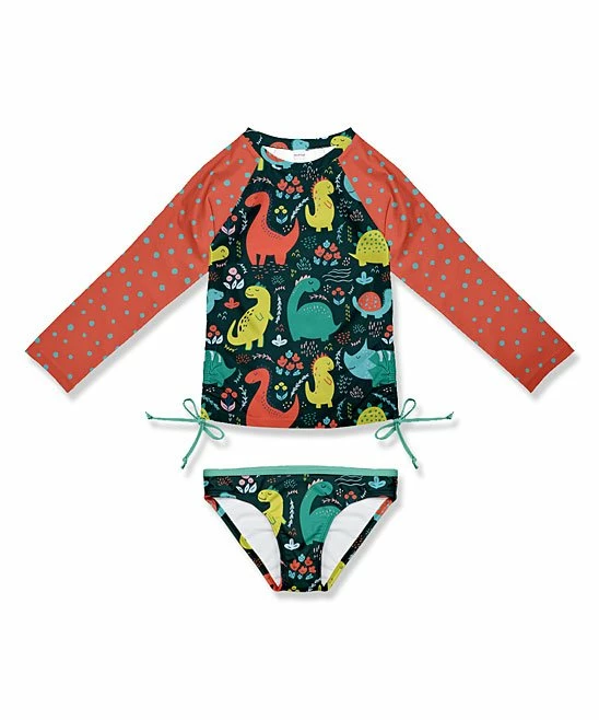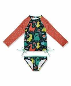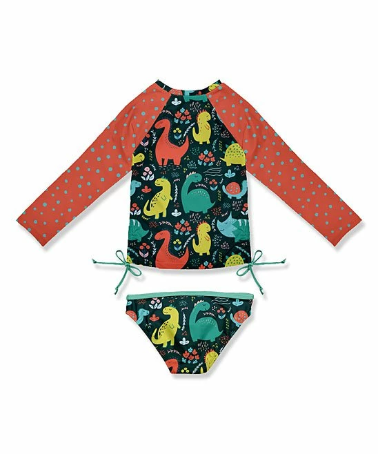 - Includes orange red dot and black dinosaur rashguard and swimsuit briefs (two pieces total)