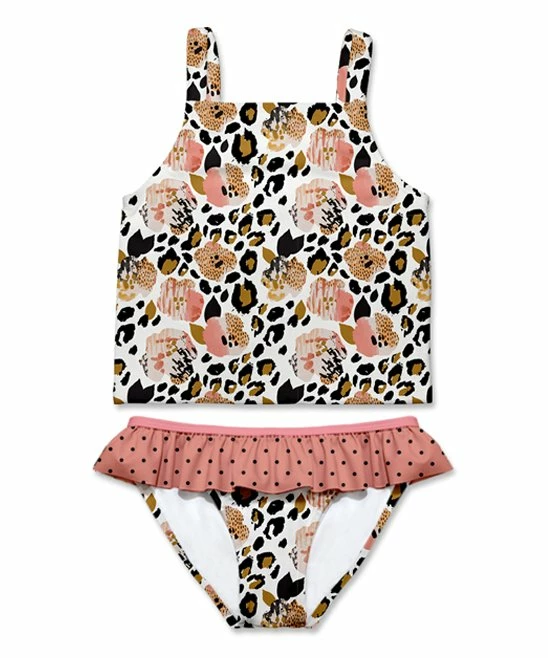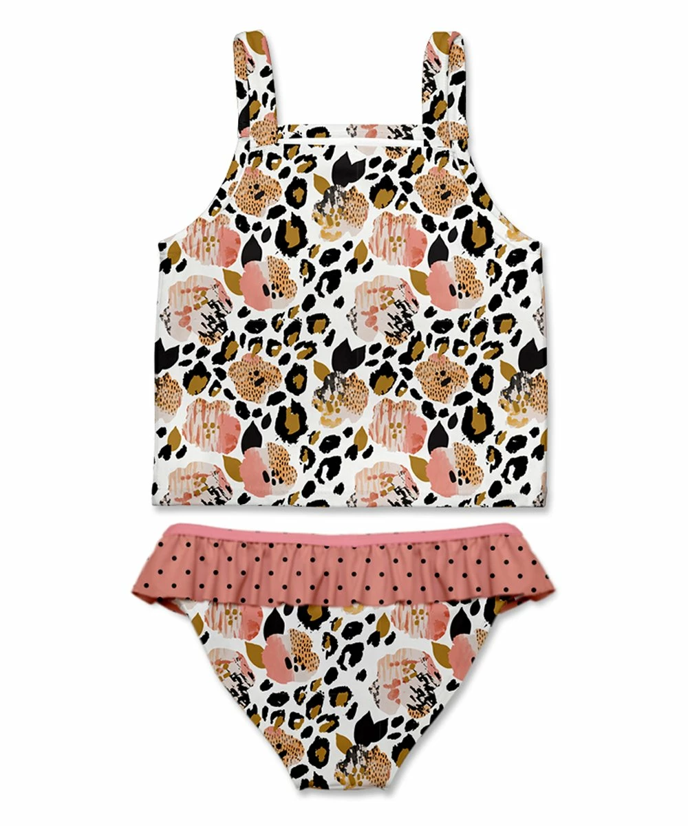 - Includes white and peach leopard floral tankini top and matching ruffle-trim bikini bottoms (two pieces total)
