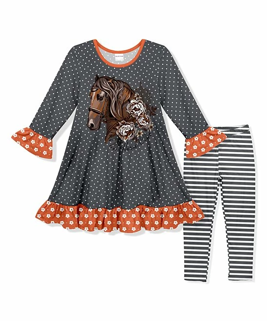 - Includes dark gray and orange polka dot and horse dress and dark gray stripe leggings (two pieces total)