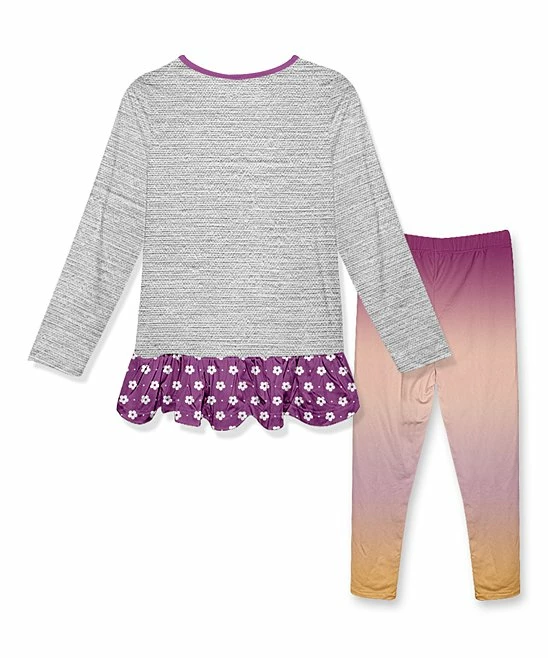- Includes one heather gray and purple owl ruffle tunic and purple and yellow gradient bow leggings (two pieces total)