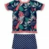 This coordinated ensemble is crafted from stretchy fabric and includes bow-accent leggings and a tunic with a ruffle trim.
