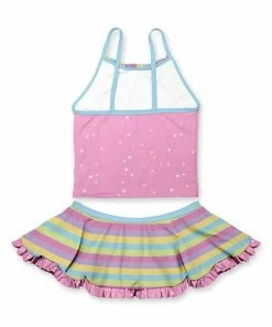 - Includes pink starry unicorn tankini and pink and green stripe skirted bottoms (two pieces total)