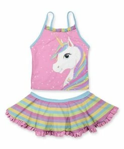 - Includes pink starry unicorn tankini and pink and green stripe skirted bottoms (two pieces total)
