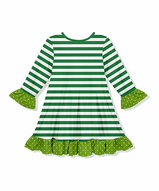 Your sweetheart will be comfy while looking charming in this long-sleeve shift dress that features ruffled trim at the sleeves and hem and a festive mix of prints.