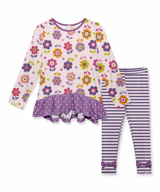 - Includes misty pink and purple floral pin dot ruffle tunic and mauve and white stripe bow leggings (two pieces total)