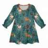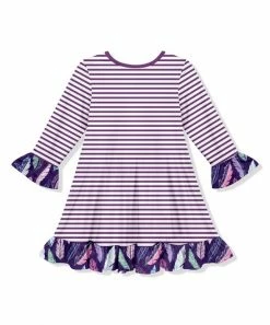 Have her looking sweet as can be for school days and play dates with this comfy shift dress trimmed in ruffles and emblazoned with a colorful feathery design for added charm.