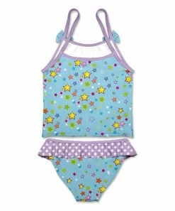 - Includes sky blue star unicorn bow tankini and matching ruffle bottoms (two pieces total)