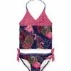 This is a retro-inspired outfit decorated with ruffles and made with plenty of stretch.