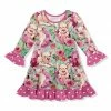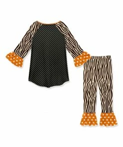 - Includes black dot ghost raglan tunic and orange floral ruffle-hem pants (two pieces total)