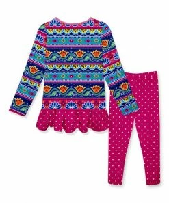 - Includes blue and hot pink stripe floral ruffle-hem long-sleeve tunic and hot pink polka dot bow-accented leggings (two pieces total)