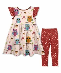 - Includes one light pink owl angel-sleeve dress and one red and white dot leggings (two pieces total)