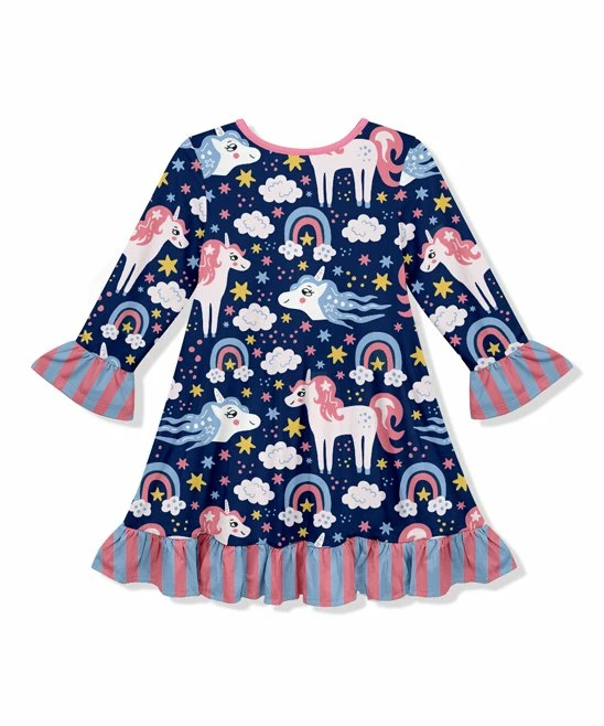 Wholesale ✔️ Wholesale ✨ Penelope Plumm Navy & Blue Stripe Clouds Unicorn Ruffle-Trim Shift 👗 👗 Dress – Toddler & 👧 Girls 🔥 🤩
