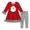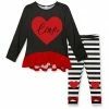 A casual-comfy set featuring a ruffle-trim dress and matching pants made with a hint of stretch. Complete with a colorful leaf print.